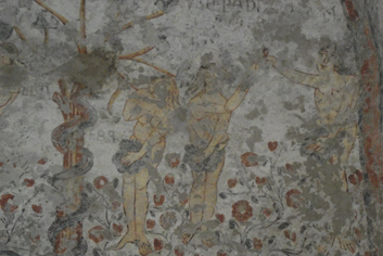 L’interno è caratterizzato da tre absidi e da affreschi che riempiono le pareti di tutta la grotta, anche per questo è detta dei “cento santi”. L’affresco più pregevole raffigura la scena biblica del “Peccato Originale” (Eva offre il frutto proibito a Adamo accanto all’albero di “fico” dove è attorcigliato il serpente). Tra gli altri affreschi, le scene della Creazione di Eva che esce dalla costola di Adamo, della cacciata del Paradiso Terrestre, la creazione della luce, etc.